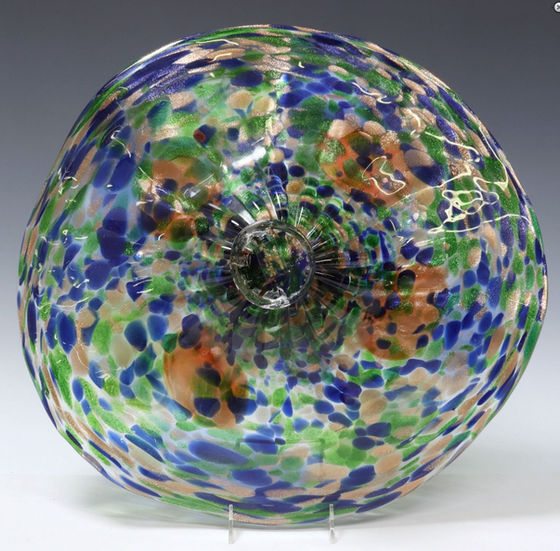 Polychrome art glass center bowl, Dale Tiffany, having flared rim with tapered base, retaining tag underfoot, approx 4.75"h, 19.75"w, 11.6lbs total