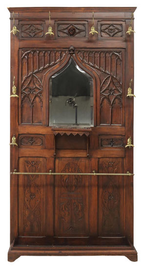 LACKING MIRROR CENTER--Gothic revival hall tree, 19th c., having molded cornice, over central protruding mask, tracery arcaded backboard, issuing eight gilt metal foliate hooks, ogee arch frame, umbrella stand over inset wood drip tray, ending on bracket feet, approx 90.5"h, 47"w, 9"d